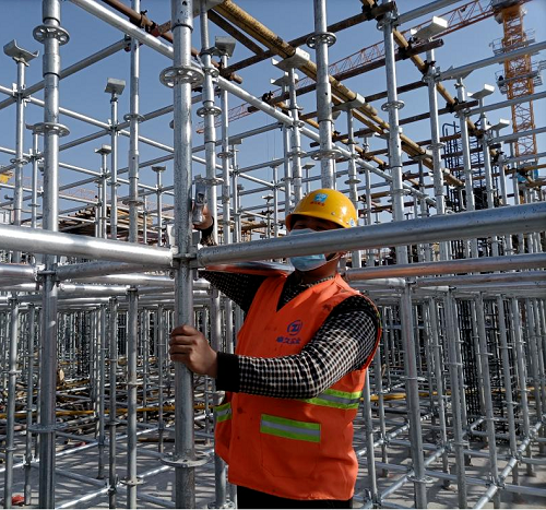 盘扣式脚手架采用自锁式连接盘和销子,销子插接后靠自重即可锁紧,且它的横向和竖向斜杆使每个单元都是固定的三角形格构式结构,架体受到横向和纵向的力之后都不会发生变形。盘扣架结合铝模形成的“铝模+盘扣架”支撑系统,二者均在专业工厂生产为标准模板和杆件,有效杜绝了现场加工过程中的安全隐患,而且相比传统模板支撑系统其结构强度、刚度、稳定性均显著提高。