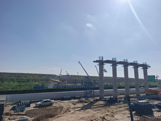在兰州新区经十七路南延连接东绕城(纬二十三路-经三十三路)道路工程项目现场可以看到,一排大型桥墩拔地而起,高耸直立,挖掘机、渣土车、压路机等大型机械正开足马力进行桥梁及路基的建设。